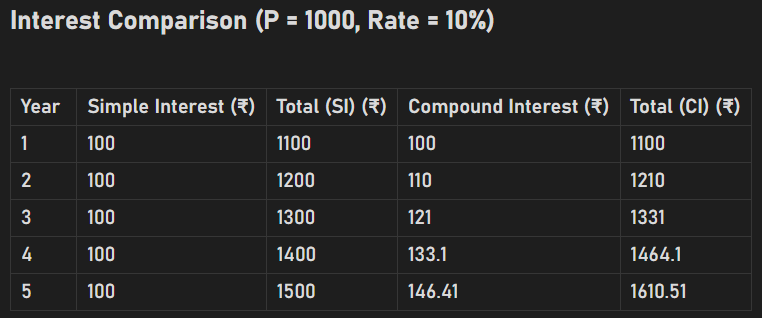 Compound Interest simply means, Interest on both Principal and Interest. Look at the following image, it shows the difference between simple and compound interests for ₹1000 at 10% interest per annum.